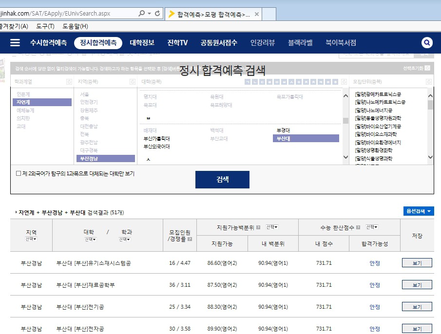 표 2015학년도 정시 일부 대학 예상지원가능점수 진학사 아주경제
